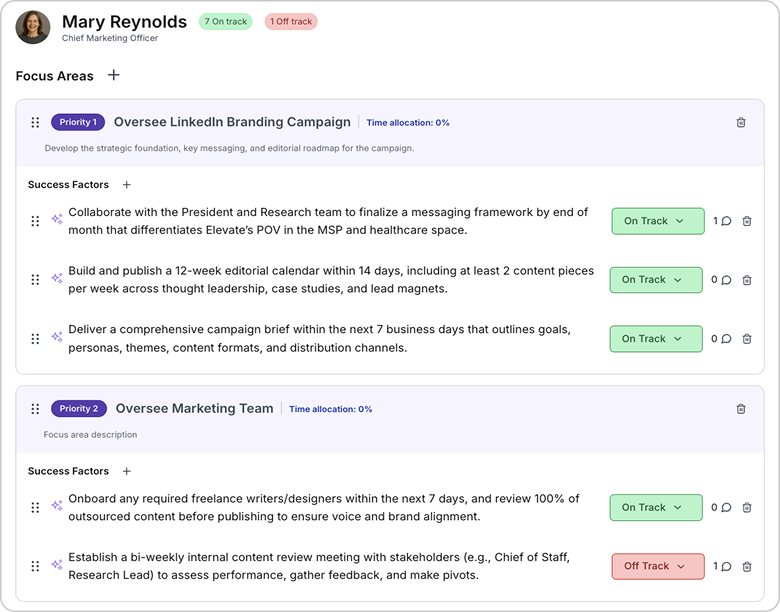 Turn responsibilities into ranked priorities, measurable goals, and time allocations so people always know what matters most.