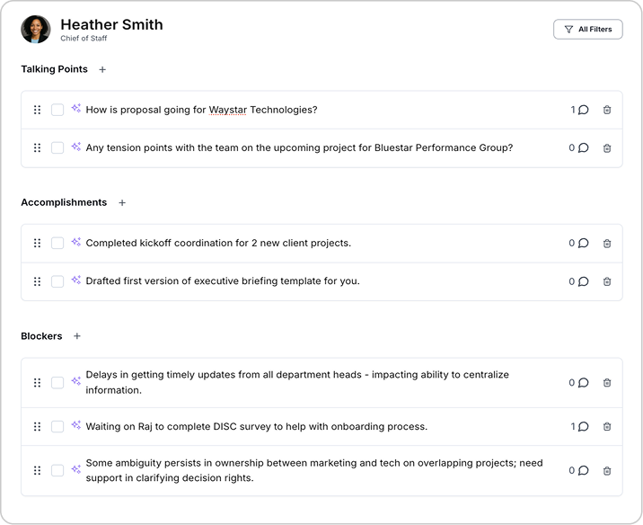 Keep every 1:1 productive by giving managers and team members a shared agenda, live insights, and recognition in one place.