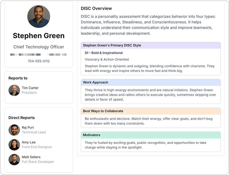 ✓ DISC assessments turned into plain-language profiles with motivators and collaboration tips